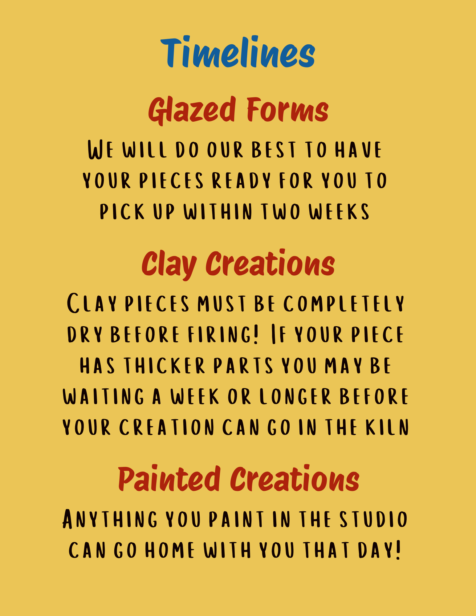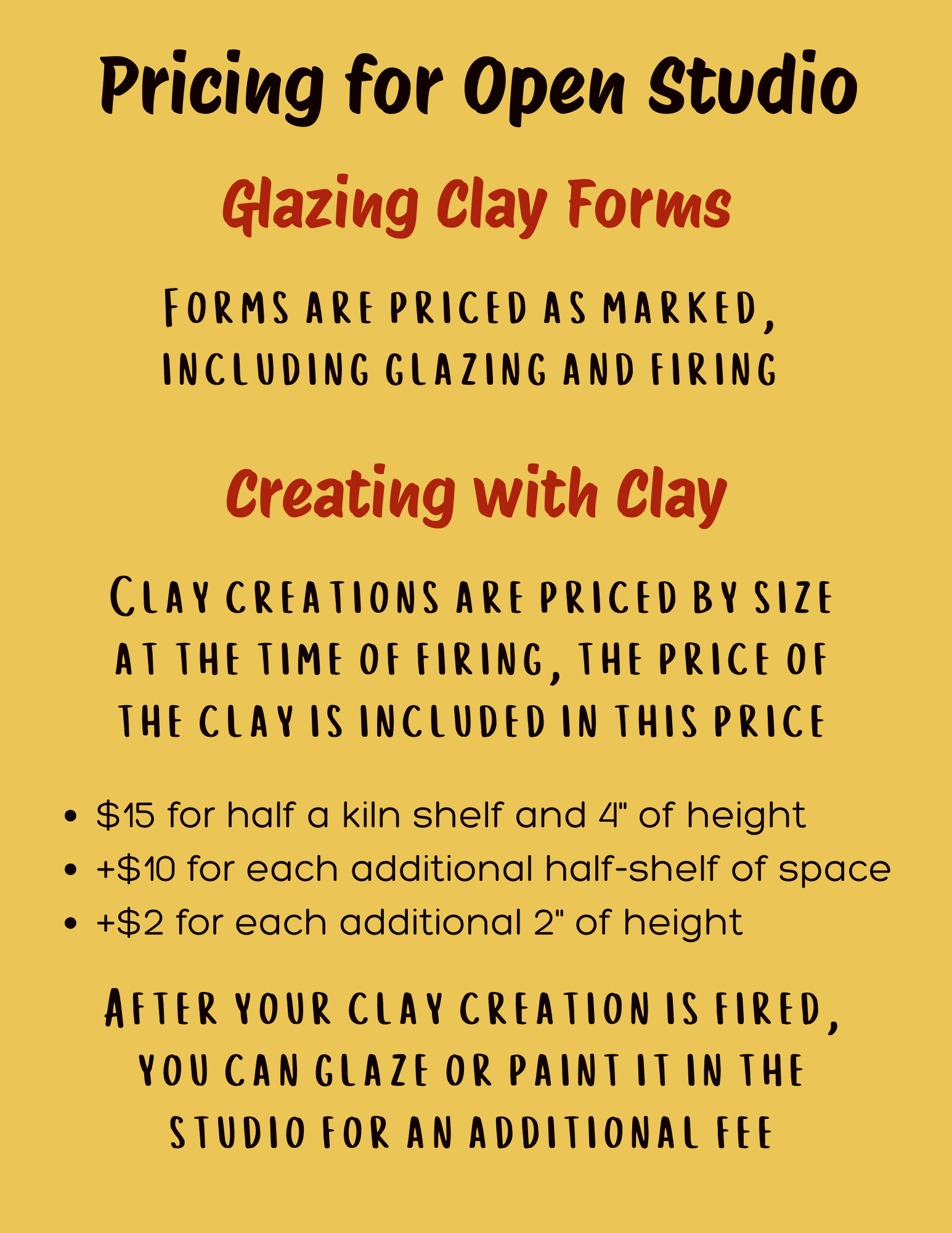 Open Studio Hours will vary depending on time of year and holidays!Check the Studio Calendar for classes and events. Regular studio hours are:Monday, Wednesday, and Friday 12:00-3:00Saturdays 10:00-4:00