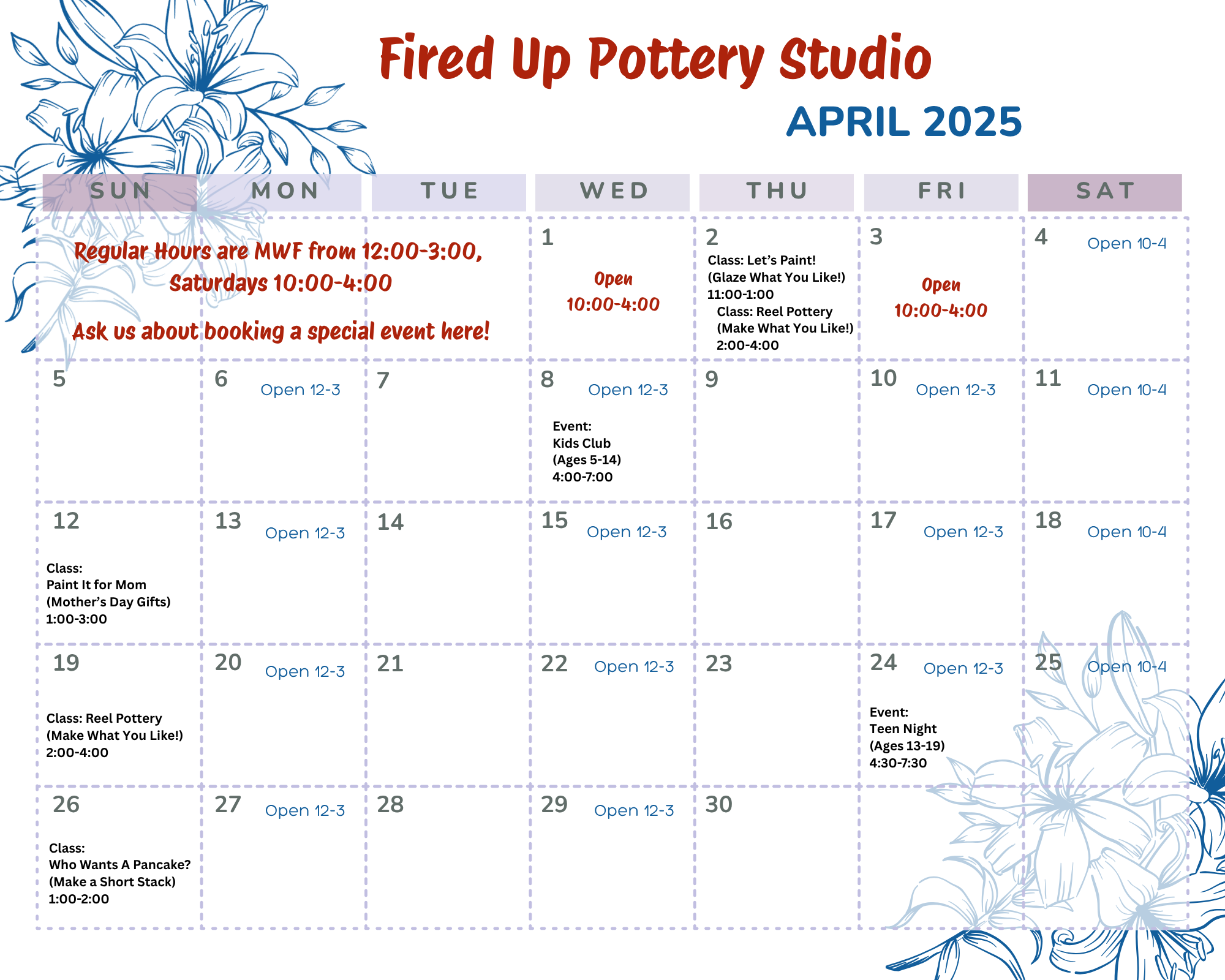 If we’re not open when you need us, contact us!Ask about opening the studio for a private event! Contact Us Regular studio hours are:Monday 12:00-3:00Wednesday 12:00-3:00Friday 12:00-3:00Saturdays 10:00-4:00 Having a Party? Have it here! Contact Us
